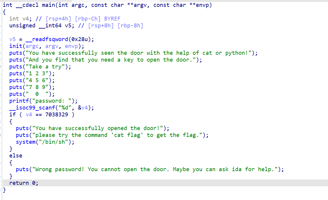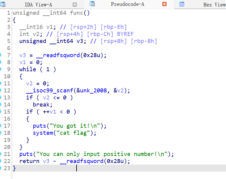 进行了一次scanf并且只能输入正数,对比需要为负数才能cat flag 想到整数溢出