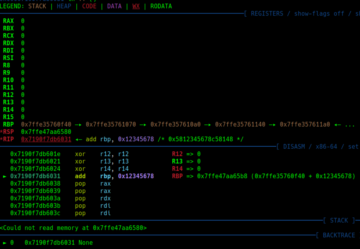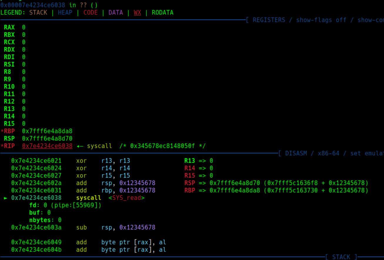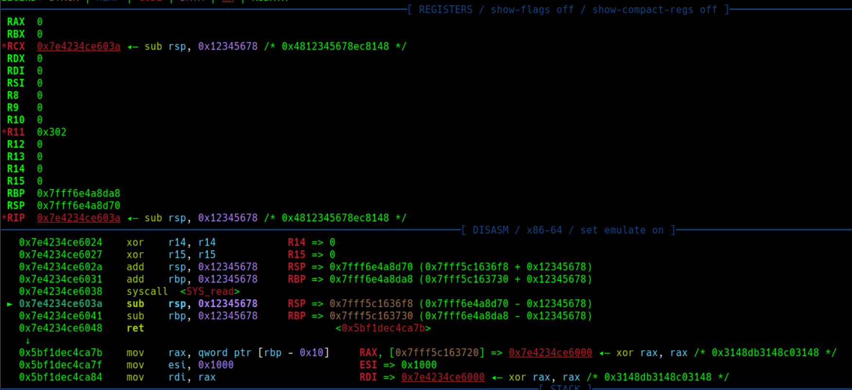 可以看到RCX被赋予了和RIP相同的值(syscall在执行系统调用前,都会将RIP保存在RCX里,全为0的寄存器相当于执行了读取0字节的read,会直接不读取结束)