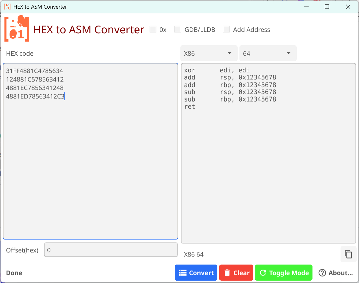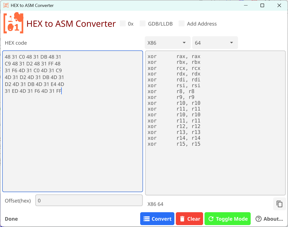 选 run your code会先执行一段汇编,这段汇编是清空除了RIP RSP的其他寄存器: