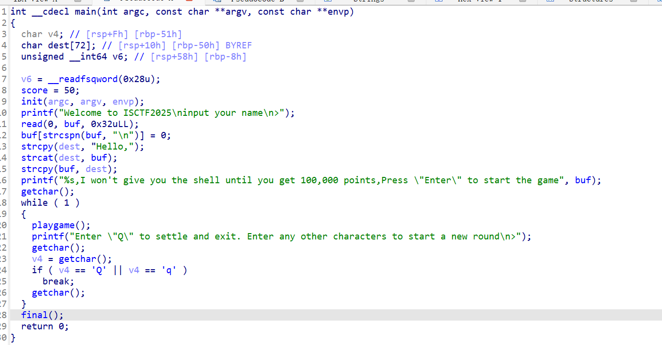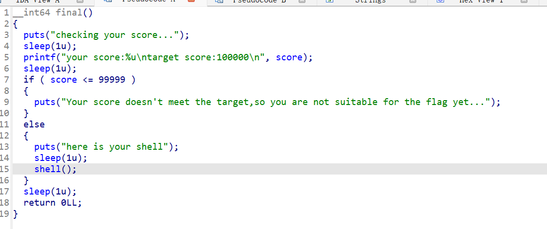想法是在第一个在bss段读名字的写入/bin/sh 然后在shell的第一个读取里利用puts泄露canary