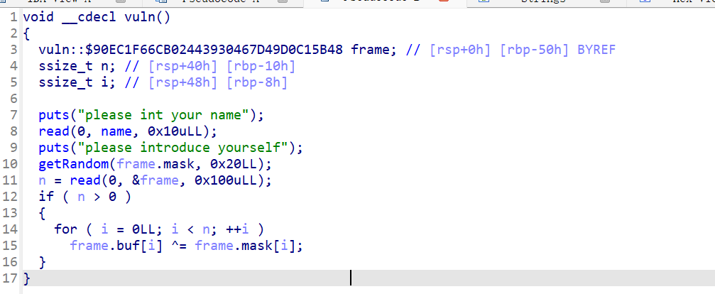函数在执行完read之后还有个异或操作 这里看不出来,但是用pwngdb调试就能看出究竟怎么异或了: