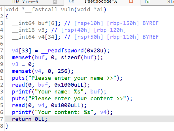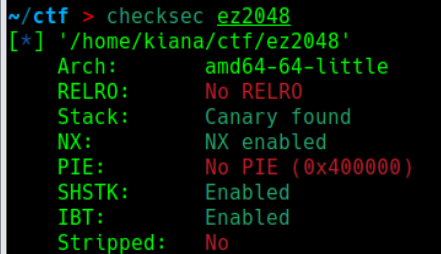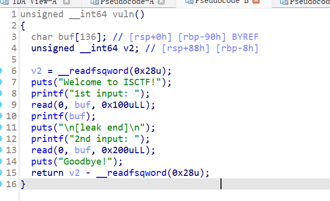 同时也有全保护,所以在第一次read泄露canary和某个text段的函数来得到PIE偏移,再在第二次read里栈溢出get shell