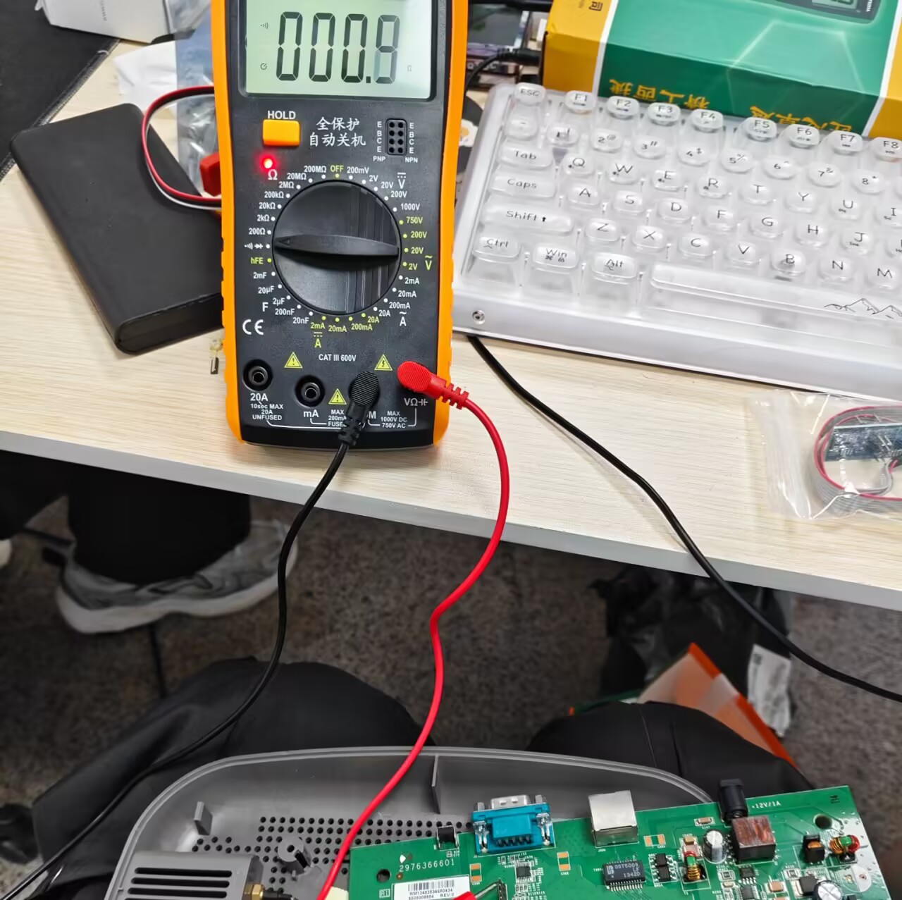 接着测试VCC针脚。给路由器插上电源,万用表调到20V直流电档,黑表笔接屏蔽罩,红表笔测试四个针脚。如果示数为3.3V左右就是VCC