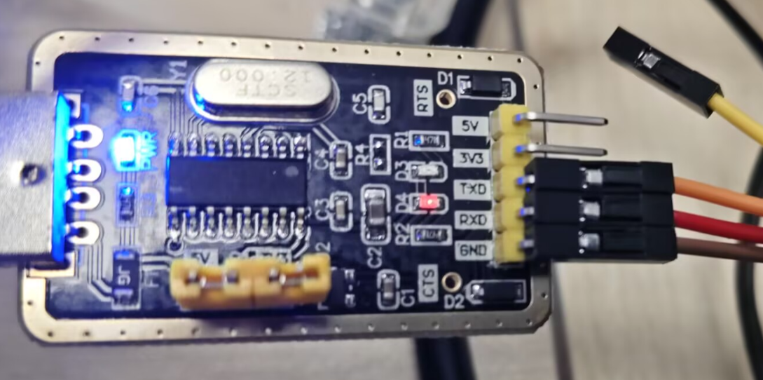 用杜邦线连接GND,RX,TX分别到CH340G的GND,TXD,RXD端上,VCC不连。
